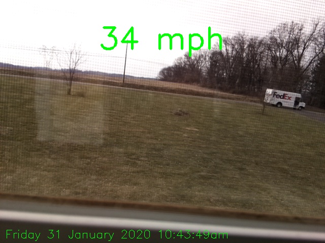 The camera is facing south and was not affixed to a mount. We pinned the camera to a piece of cardboard and taped it to a window. We have verified that the images of vehicles traveling west are within 1 mph of actual speed. There are issues with the vehicles traveling east because of our cardboard/tape situation. The polygon we drew to measure speeds was not aligned perfectly with the road. It was slightly higher on that end and as a result the vehicles are actually traveling 4-9 mph faster than recorded. As you can see in the third image on the carousel we may also have an issue when multiple vehicles enter the frame. We hope that the heating oil truck is actually going 25mph when the car behind it enters the frame. It remains a work in progress.
